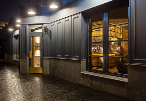 The bar is located in a 1901 building that was formerly a stable for city carriages. During renovation, two authentic stone walls were preserved where horse feeders once stood.