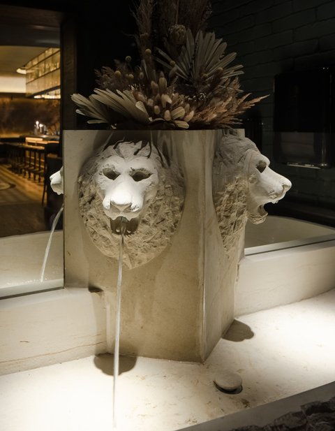 Shelves around the large vase and mirrored “portal” above the bar store nearly 300 bottles.