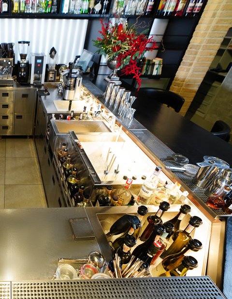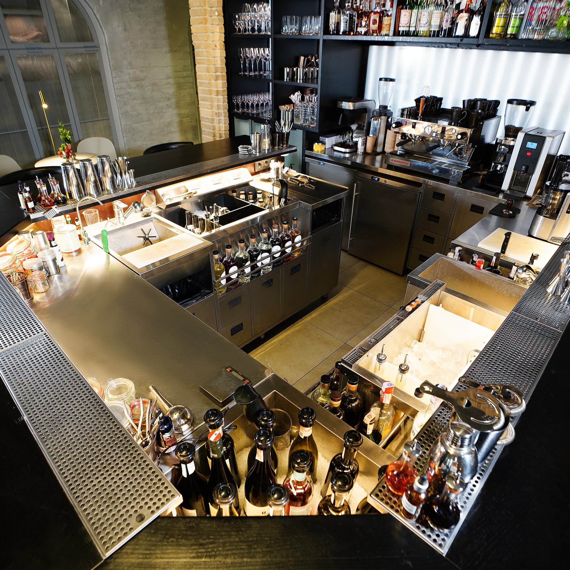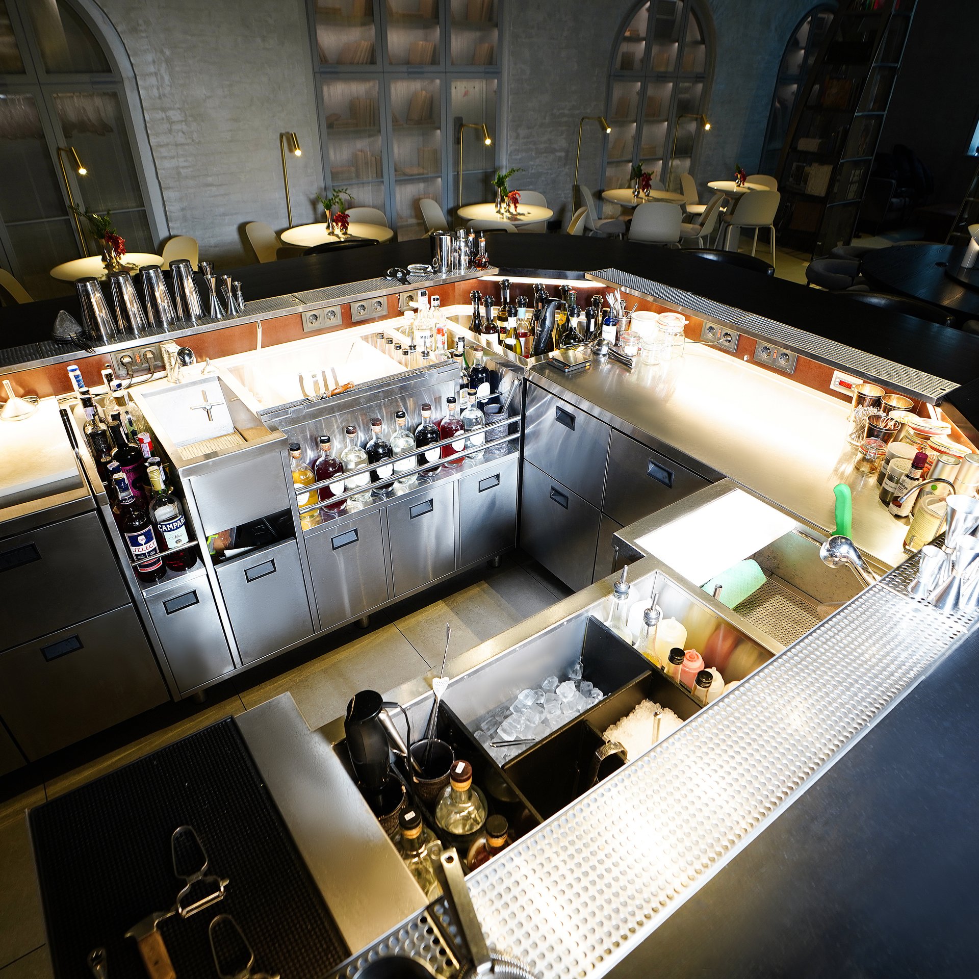 The bar counter at Zweig echoes the arched contours of the heritage architecture, uniting conceptual historical elegance with contemporary bar technology. Initially designed as a compact workstation for a single bartender, it was later upgraded following the venue’s success. A second cocktail station with a sparkling wine bath replaced the original fridge, allowing a smooth workflow for two bartenders and a barback even during peak hours.