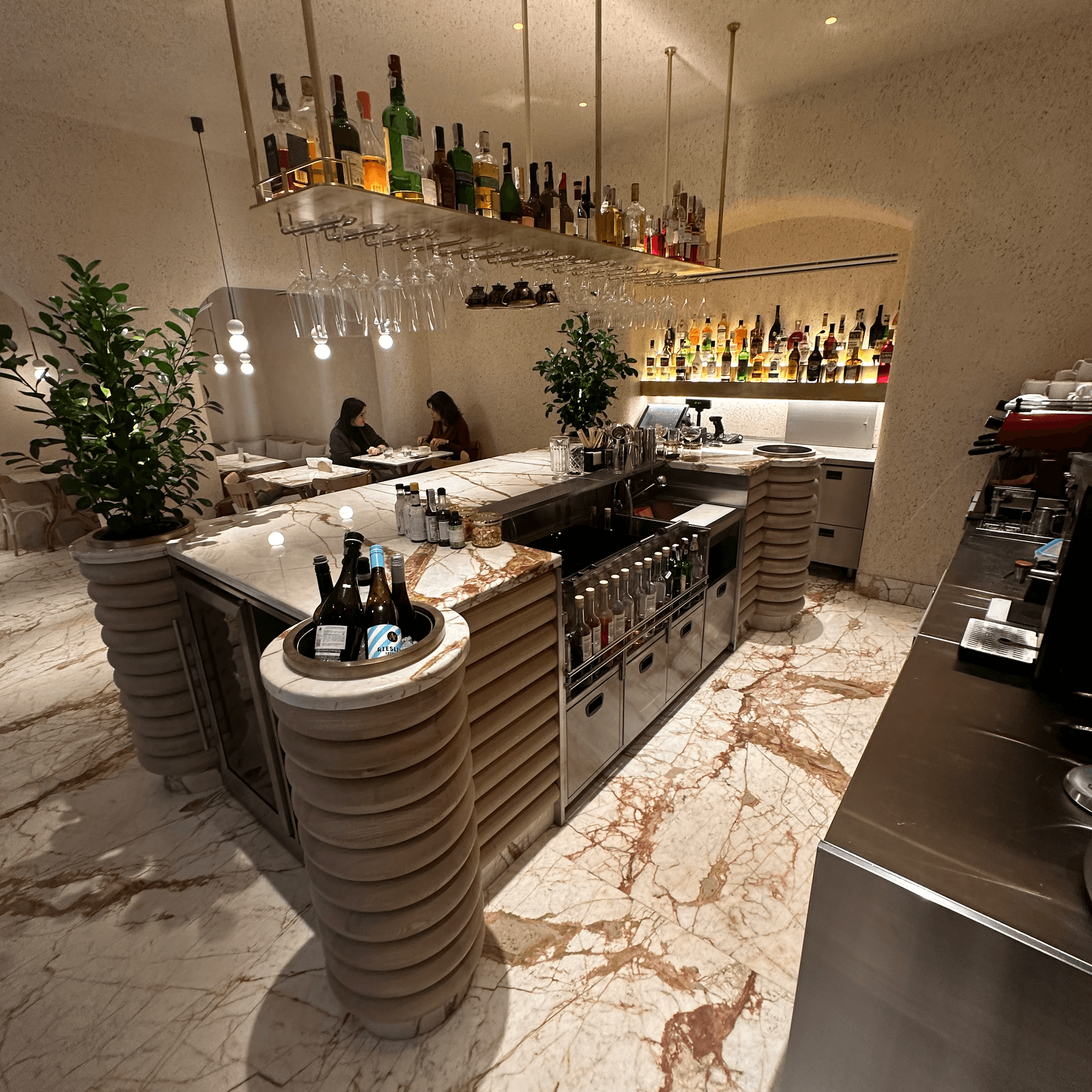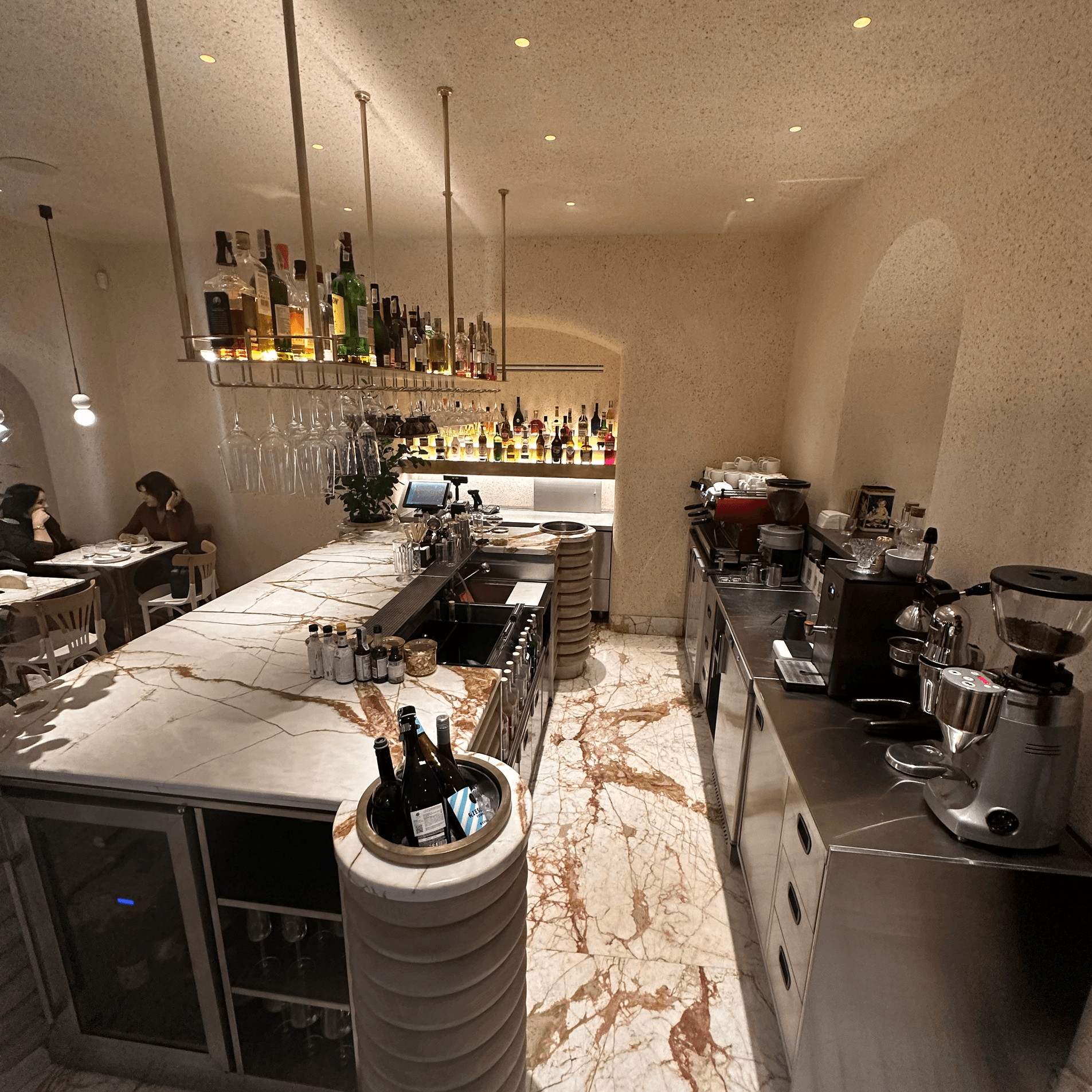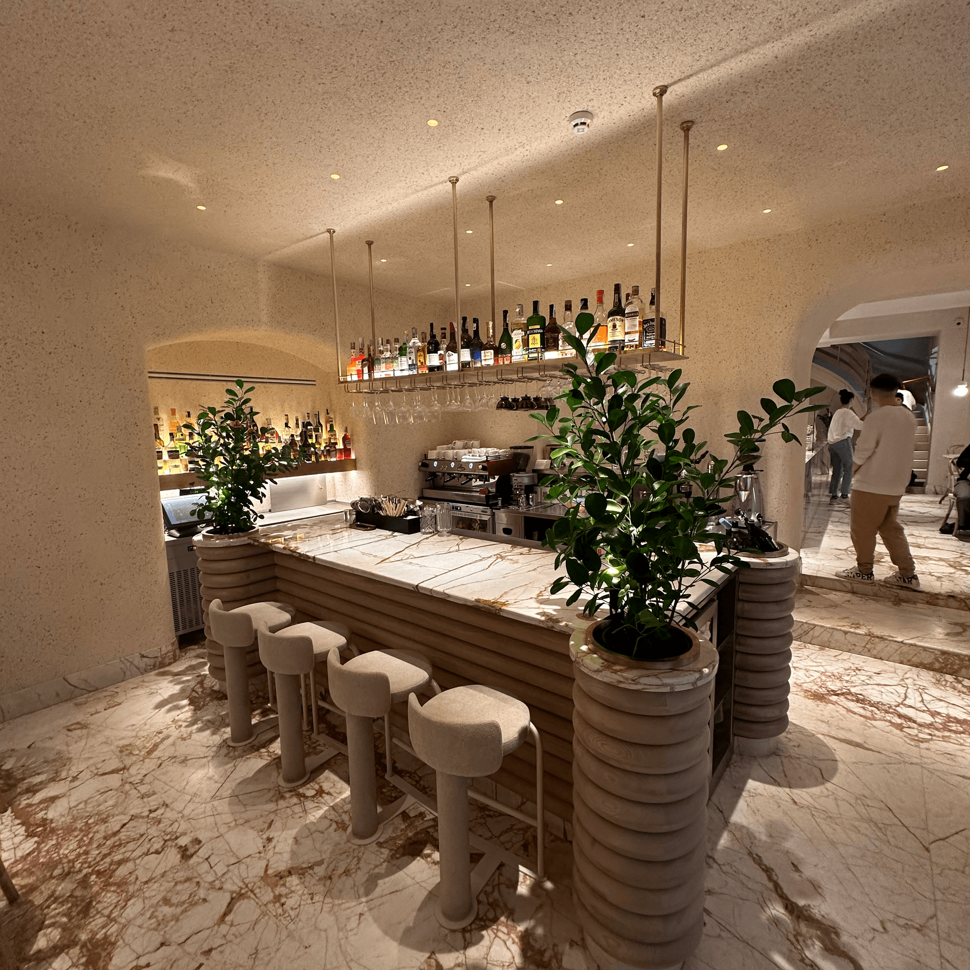We’ve created a bar that stays at the center — not only of the space but also of attention. Together with YOD Group, we developed the “bar table” format, which allowed us to maintain seating density without losing the elegance of the space. Inside — everything needed for the job: refrigeration units, bar equipment, sparkling wine baths, and at the ends — live plants, adding a light touch to the form. We hid the technical processes in the wall so that nothing would distract guests from the main thing: the moment when the cocktail meets the dessert, and the classics are reimagined.