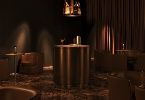 Only the essentials: work surface, rinser, ice container, and chilled glassware. Everything needed to mix a Dry Martini or Manhattan — either alongside the guest or entrusted entirely to them.