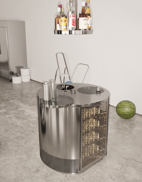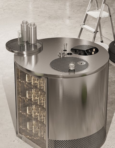 Тільки essentials: робоча поверхня, рінзер, ємність для льоду, охолоджений посуд. Достатньо, щоб змішати Dry Martini або Manhattan — разом із гостем, або довірити це йому.